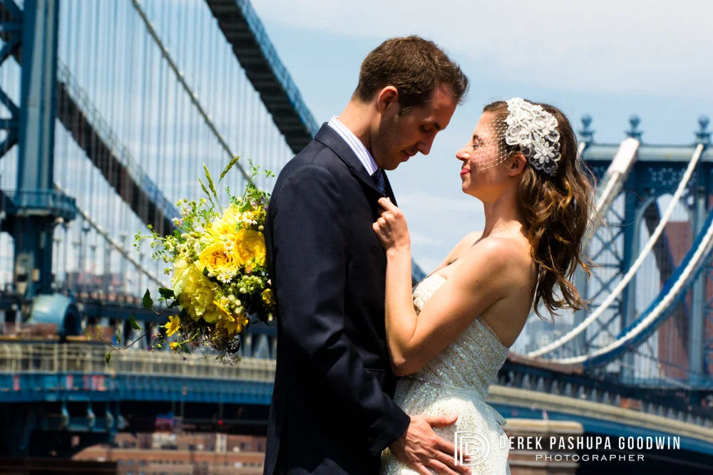 The bride and groom on the ReBar rooftop with the Manhattan Bridge in background